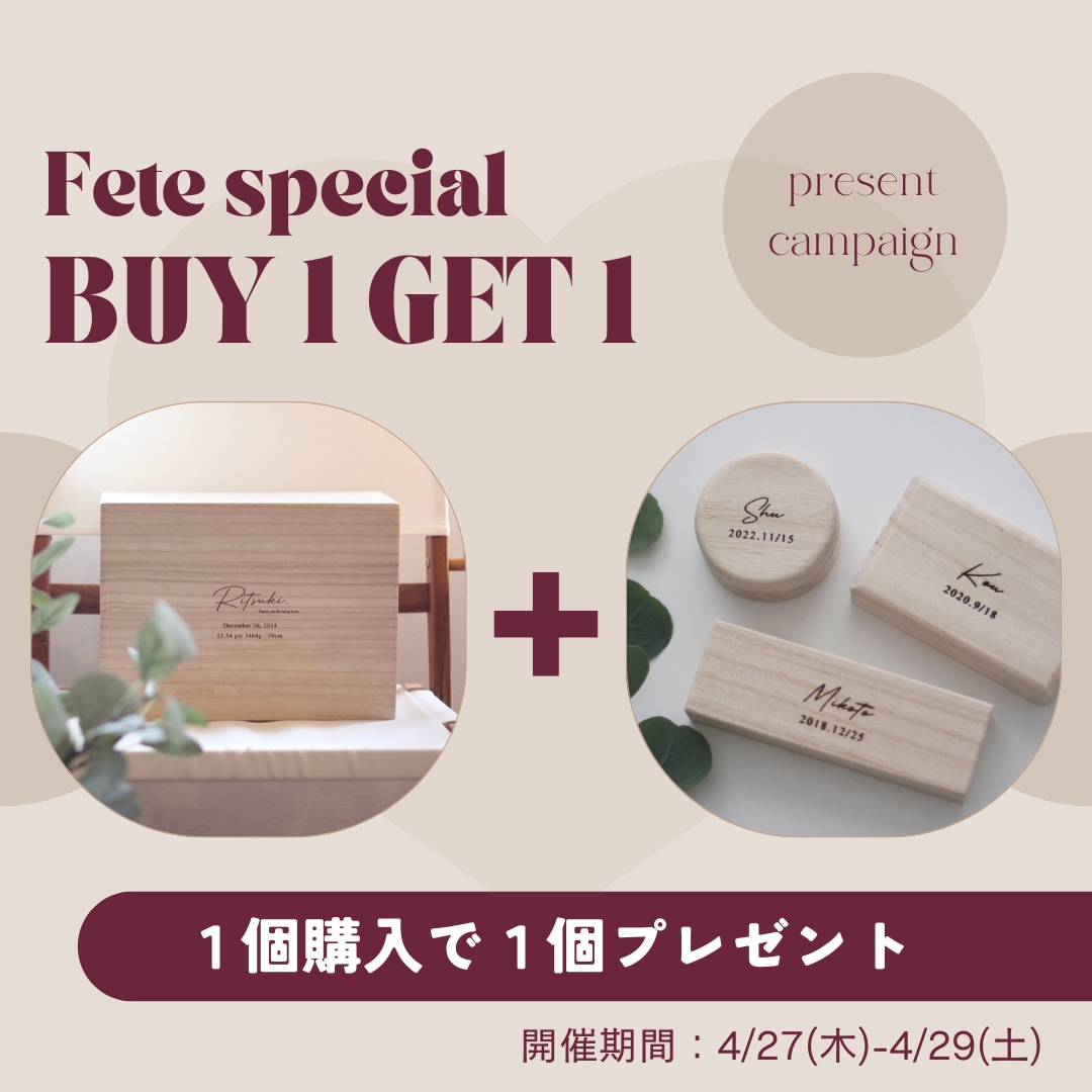 メモリアルボックスを一つ購入ごとに丸型乳歯ケース、へその緒ケース、産毛ケースの中から1つをプレゼント。